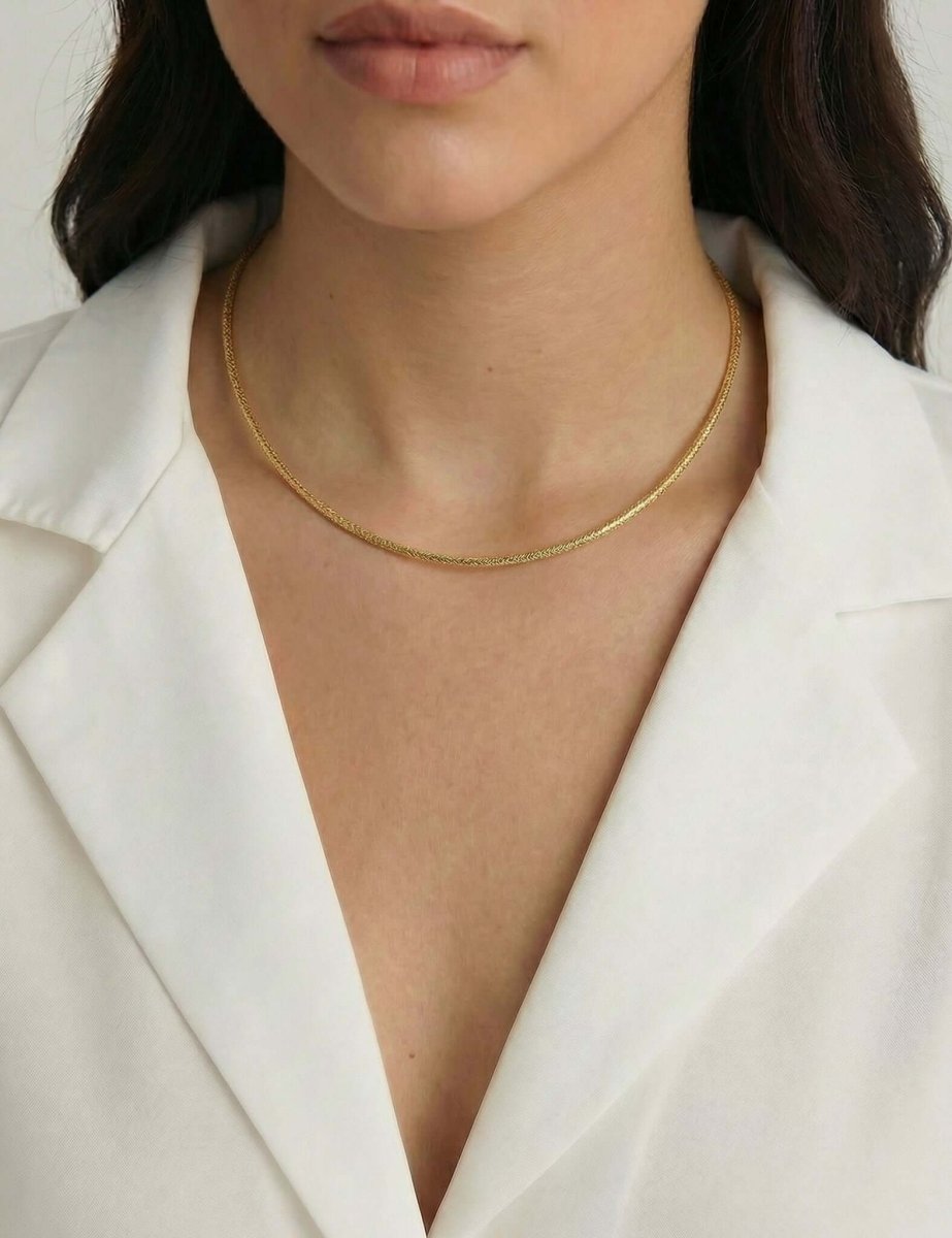 A smooth, flat-laying omega chain that forms a clean, semi-rigid arc at the neckline—polished enough to wear solo and effortless to layer. Made in Italy in gold-plated 925 sterling silver.