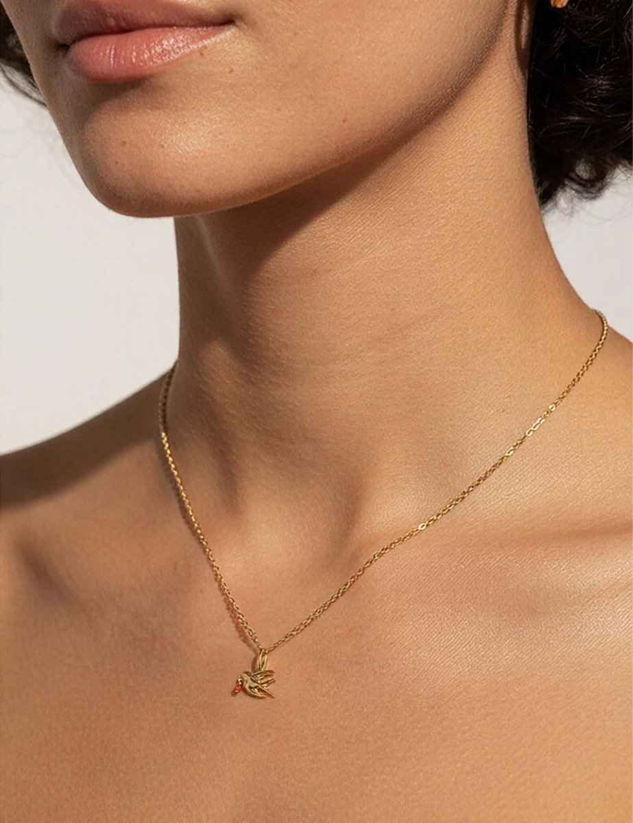 A swallow charm with light, effortless movement—classic and meaningful. Gold-plated sterling silver, handmade in Thailand—easy to layer and wear daily.
