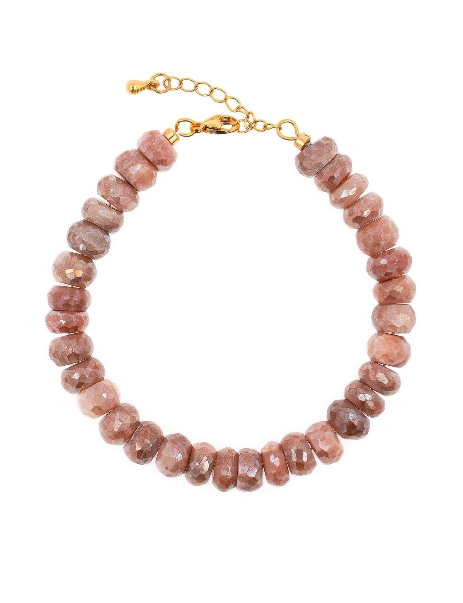 Model showcasing New York Ashrose Moonstone Faceted Bracelet and necklace in soft rose and gray hues.