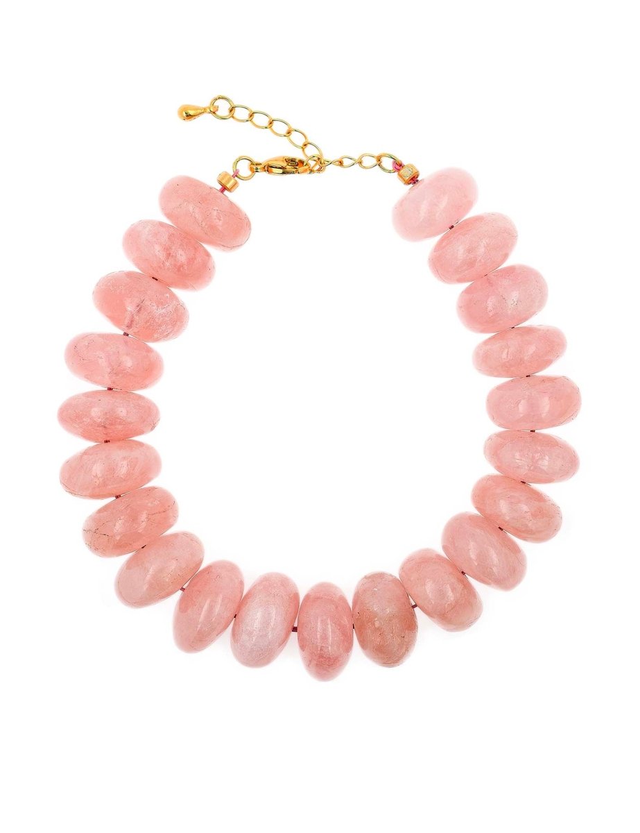 Woman wearing pink gemstone necklace and bracelets, showcasing elegant beaded jewelry.
