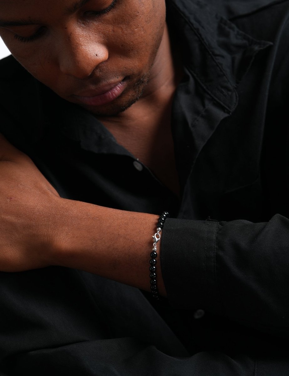 Model wearing BEAMMORE black onyx beaded bracelet – Elegant birthstone jewelry gift for men