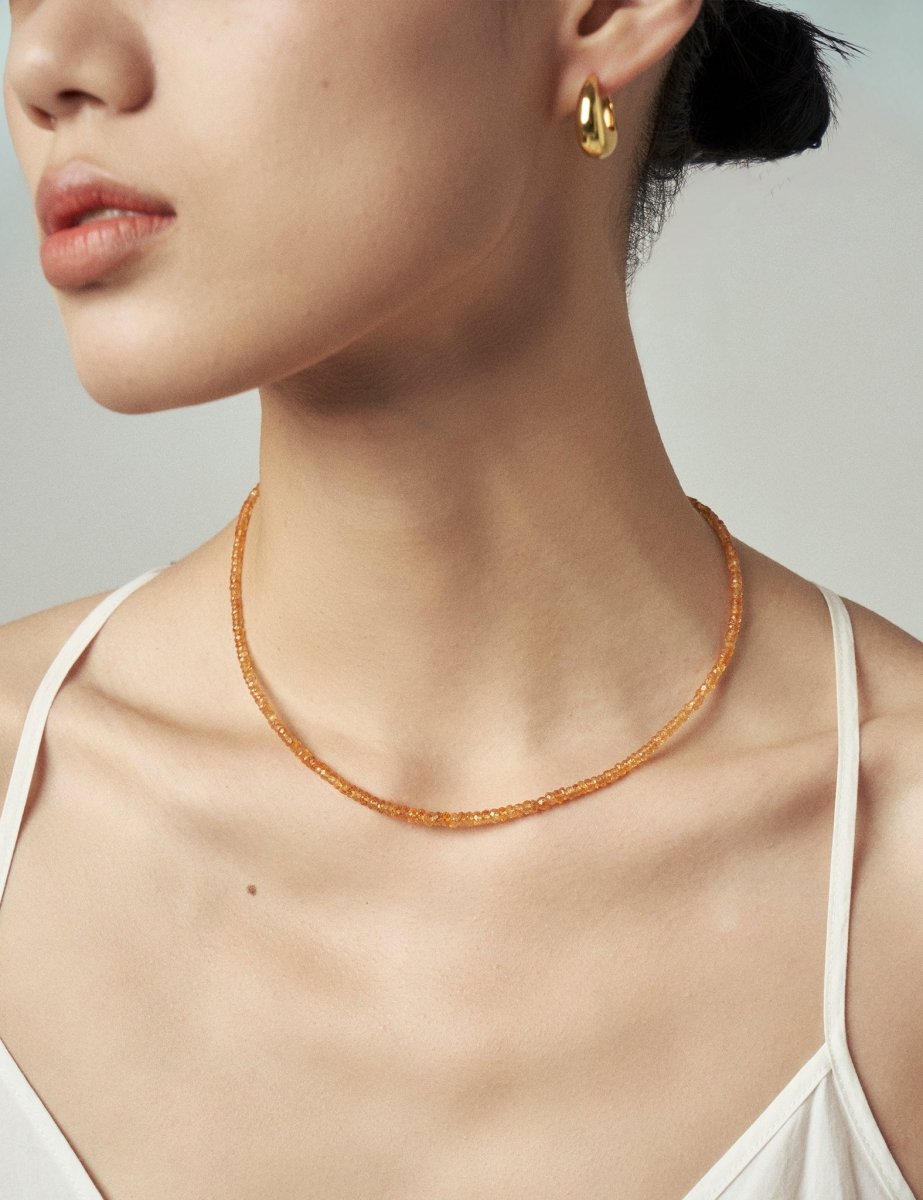 Model wearing BEAMMORE orange garnet beaded necklace – Elegant birthstone jewelry gift for women