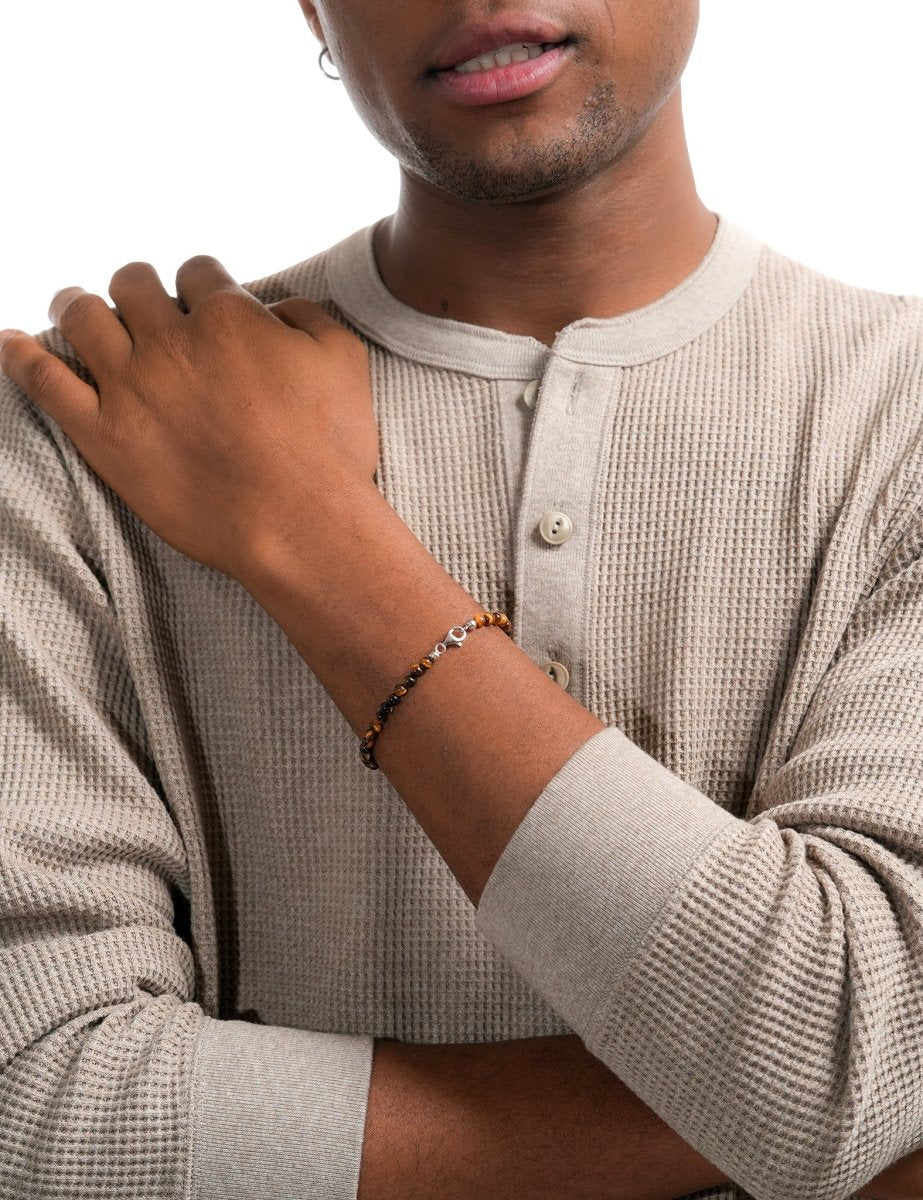Model wearing BEAMMORE tiger’s eye beaded bracelet – Elegant birthstone jewelry gift for men