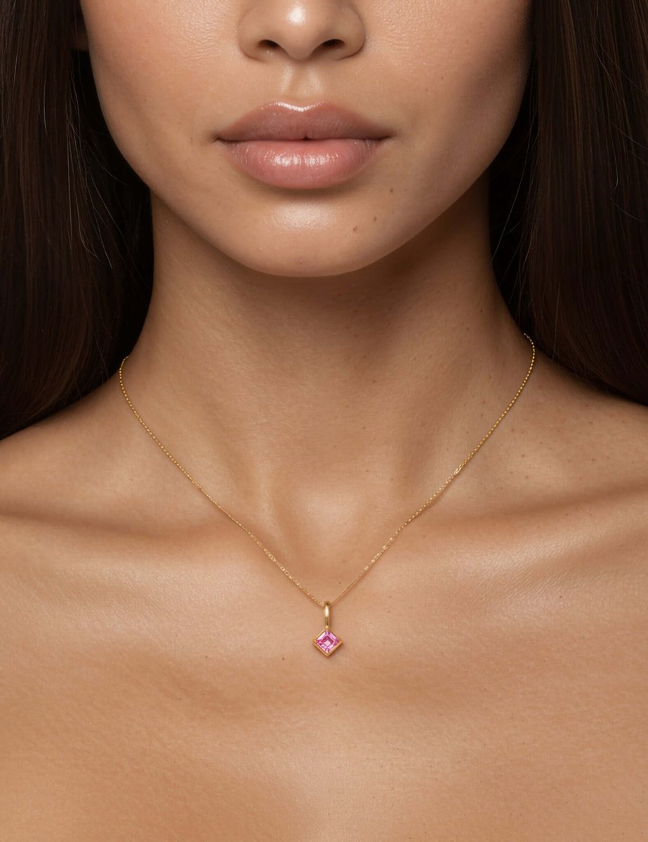 A clean square pop of pink that lifts any chain instantly. Gold-plated sterling silver, handmade in Thailand—easy to wear solo or stack with your favorite charms.
