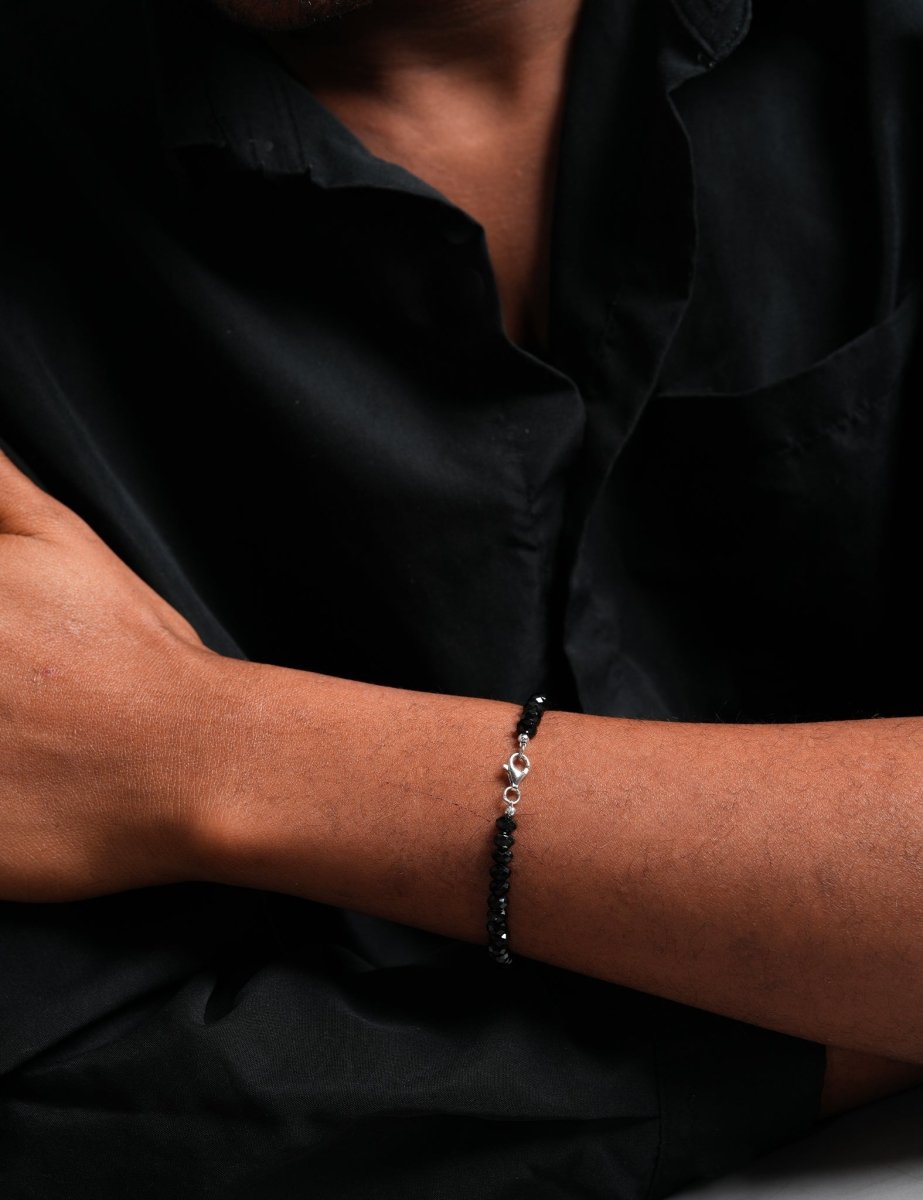 Model wearing BEAMMORE black onyx faceted 4×6mm bracelet – Clean, modern style