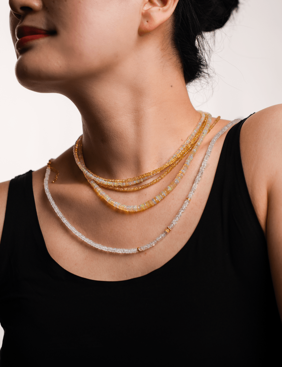 Woman wearing multiple strands of Wealth Yellow Opal Faceted Necklace showcasing its golden energy and elegance.