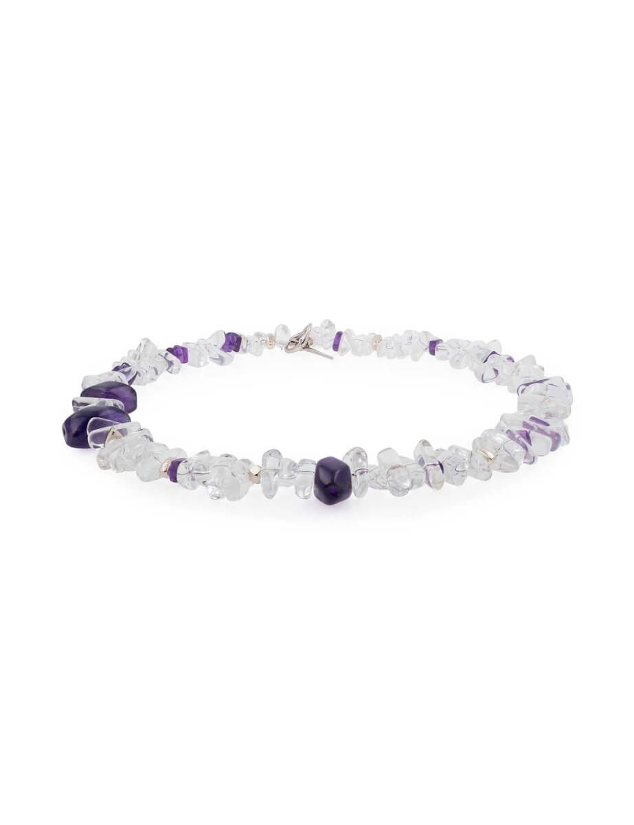 Violet and crystal-clear light in one clean line. This necklace pairs amethyst + clear quartz for a bright, modern glow that catches the sun beautifully—easy to wear daily, elevated enough for occasions.