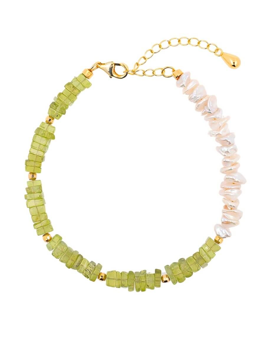 A petal pearl with a soft glow, finished with peridot for a fresh spring-green accent. Peridot is traditionally associated with renewal, positive energy, and fresh starts—a bright, uplifting piece that shines in the sun.