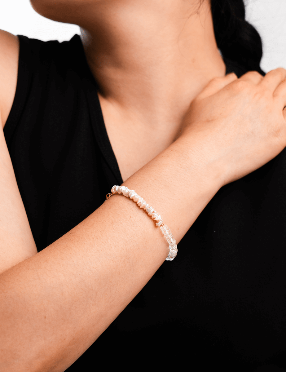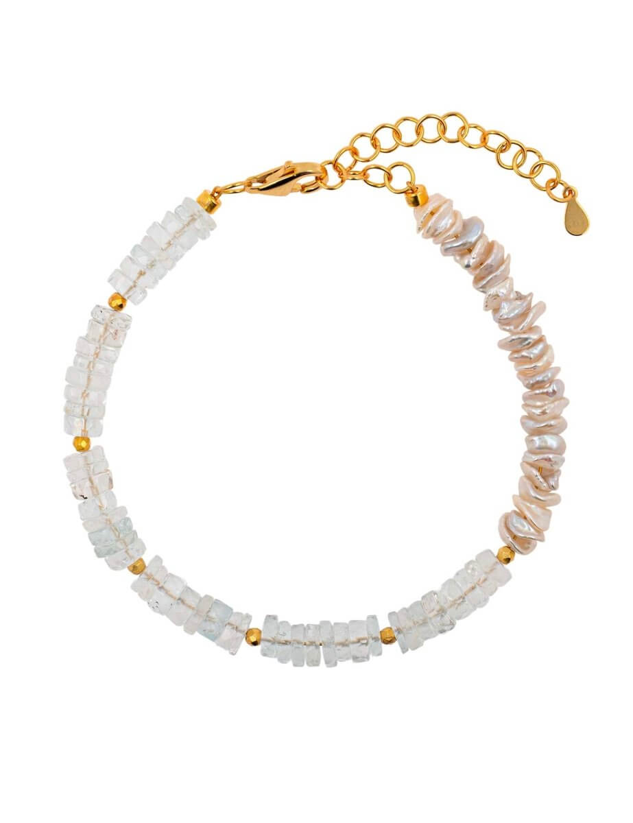 A soft pearl glow finished with topaz accents for a clear, light-catching sparkle. Topaz is traditionally associated with joy, clarity, and confidence—an easy bracelet that brightens the neckline instantly.