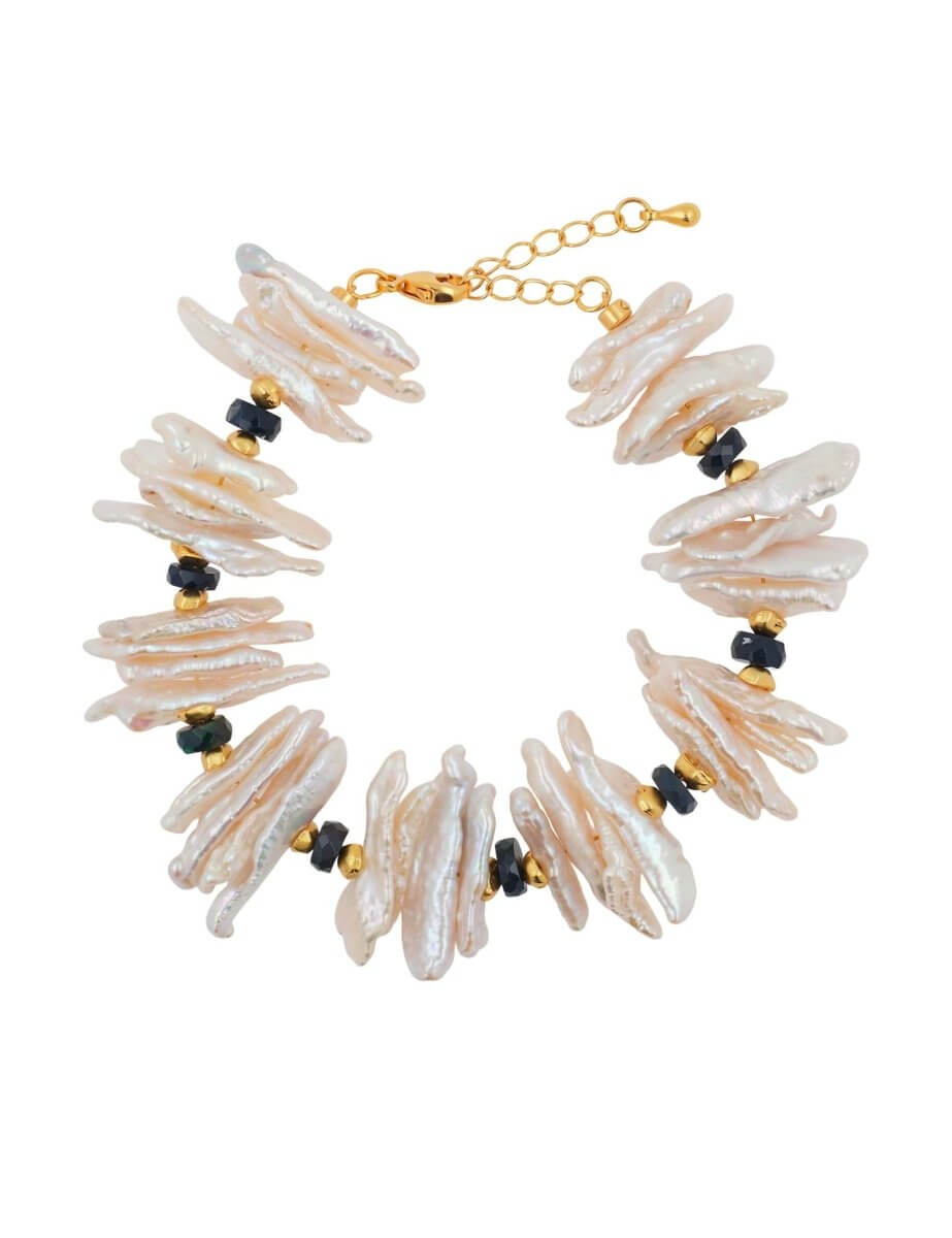 Organic pearl shine with a dark, modern edge. Biwa-style stick pearls create statement volume, while black opal accents add an iridescent shift in the light. Traditionally associated with inspiration and protection, it’s a standout piece for nights out and meaningful gifting.