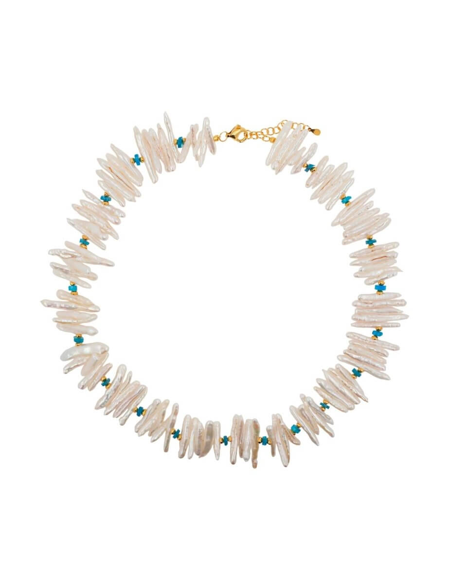 Bright, modern, and full of movement. Biwa-style stick pearls bring bold texture, finished with blue apatite accents for a vivid ocean-blue glow. Traditionally associated with clarity and creativity, this necklace instantly lifts your energy and your look.