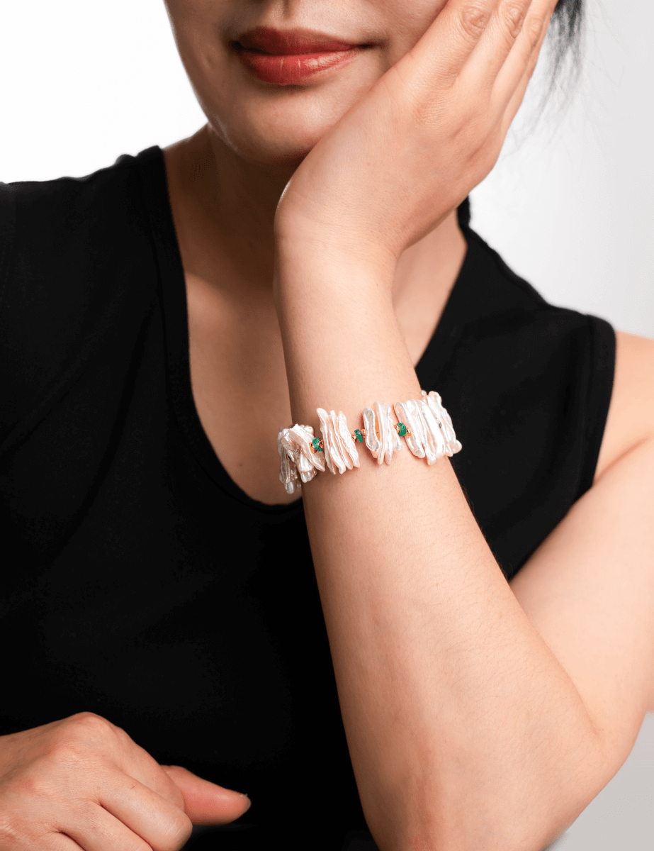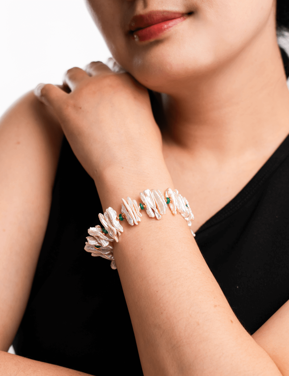 Organic pearl texture meets crisp green sparkle. Biwa-style stick pearls create bold presence, paired with faceted green agate accents for a fresh, light-catching finish. Traditionally associated with balance and renewal, it’s a standout bracelet that still feels wearable.