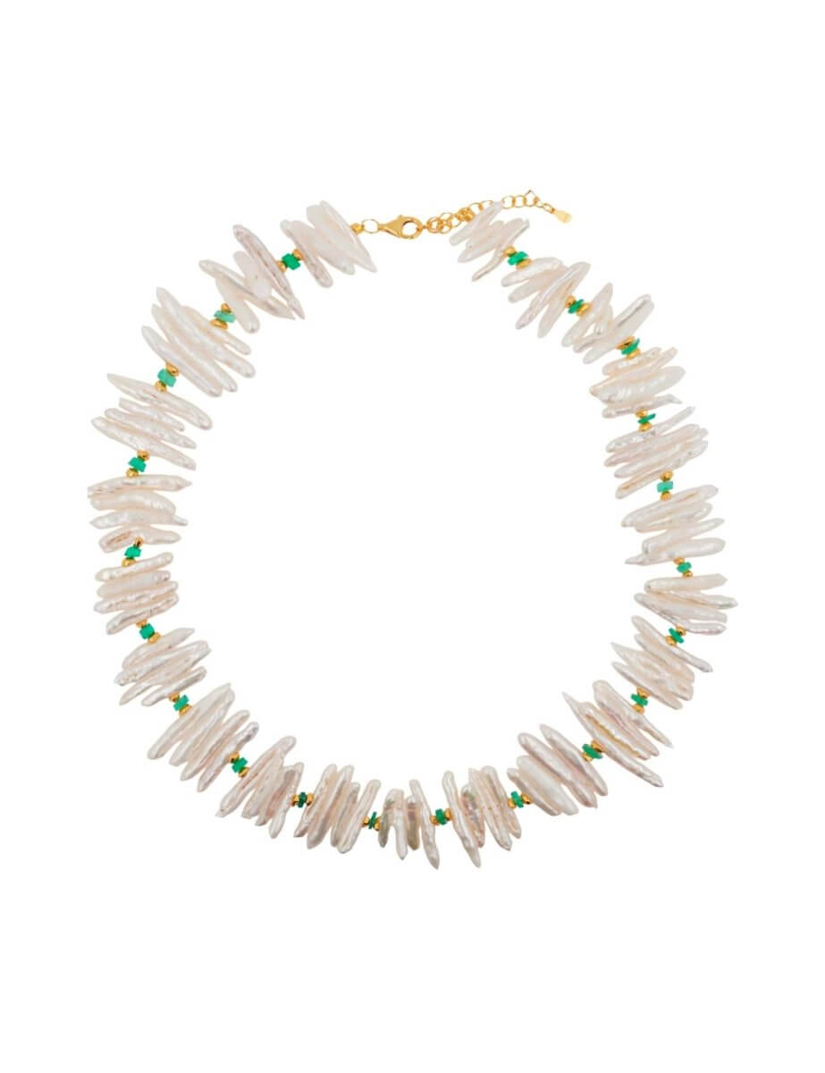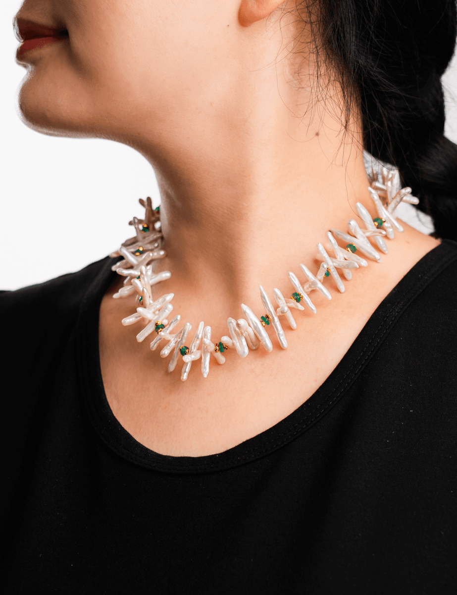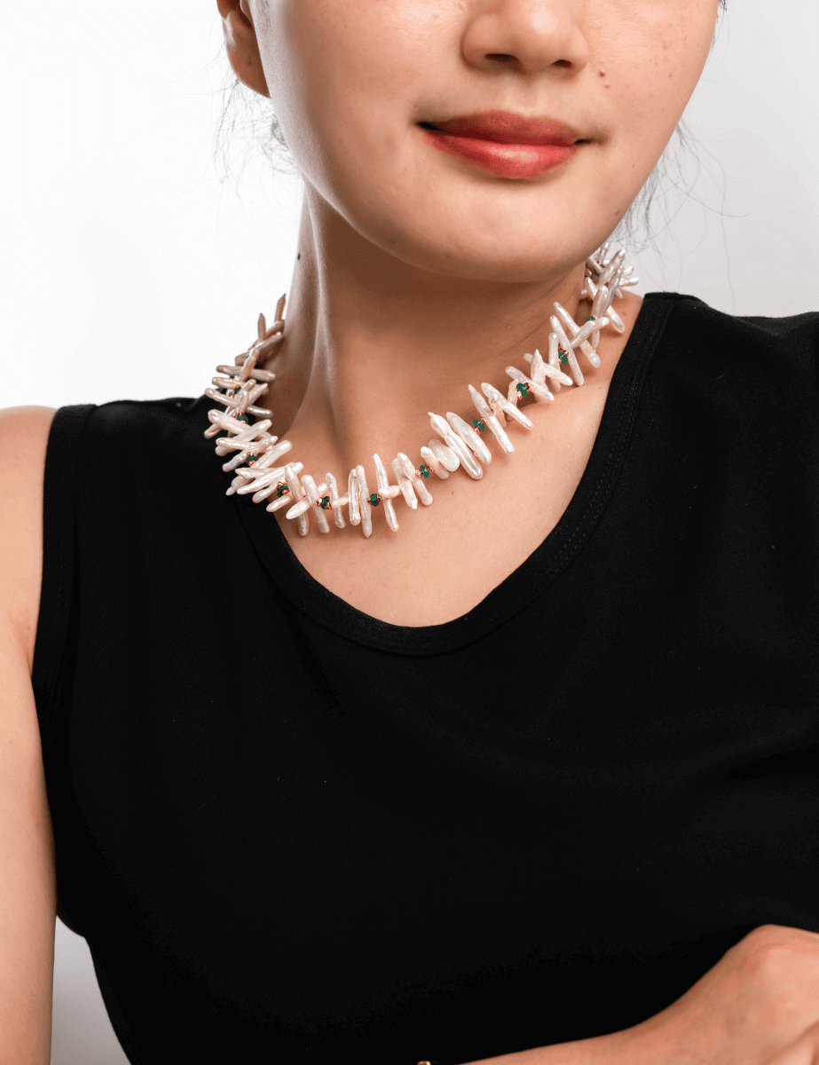 Fresh green sparkle meets organic pearl shine. Biwa-style stick pearls create a strong visual rhythm, paired with green agate accents that catch the light. Traditionally associated with growth and balance, this necklace feels energizing, polished, and easy to wear.