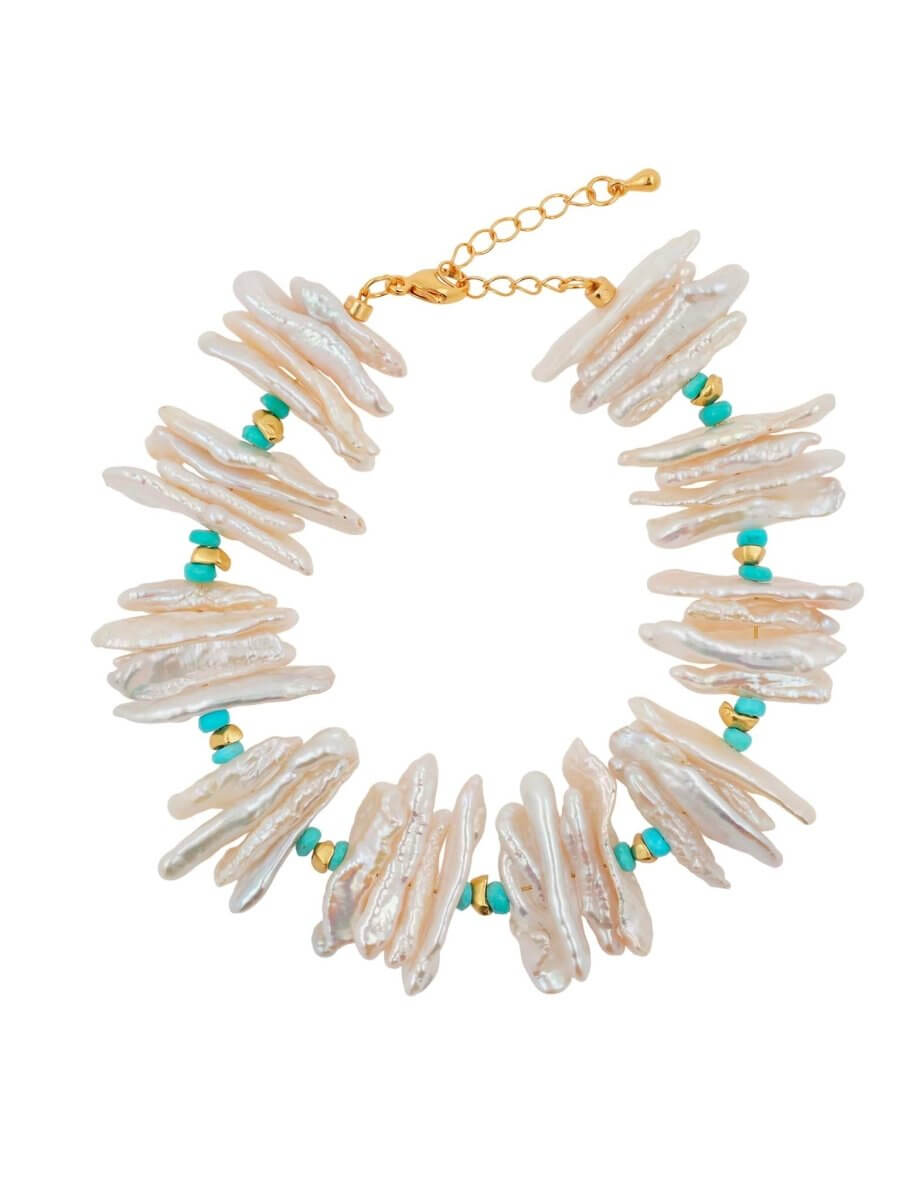 A bold pearl statement with a fresh blue-green edge. Biwa-style stick pearls bring organic volume, finished with turquoise accents that pop beautifully in sunlight. Turquoise is traditionally associated with protection and calm—perfect for summer styling and meaningful gifting.