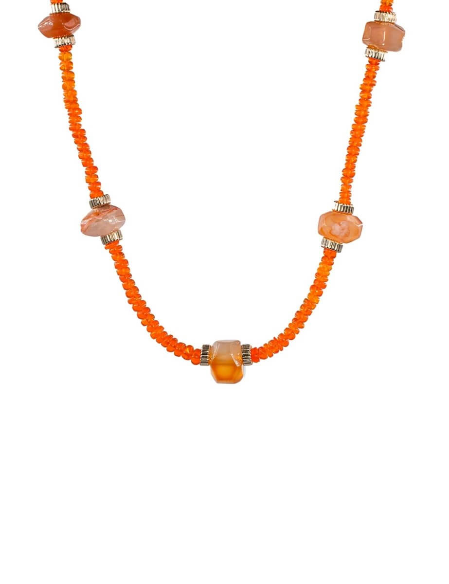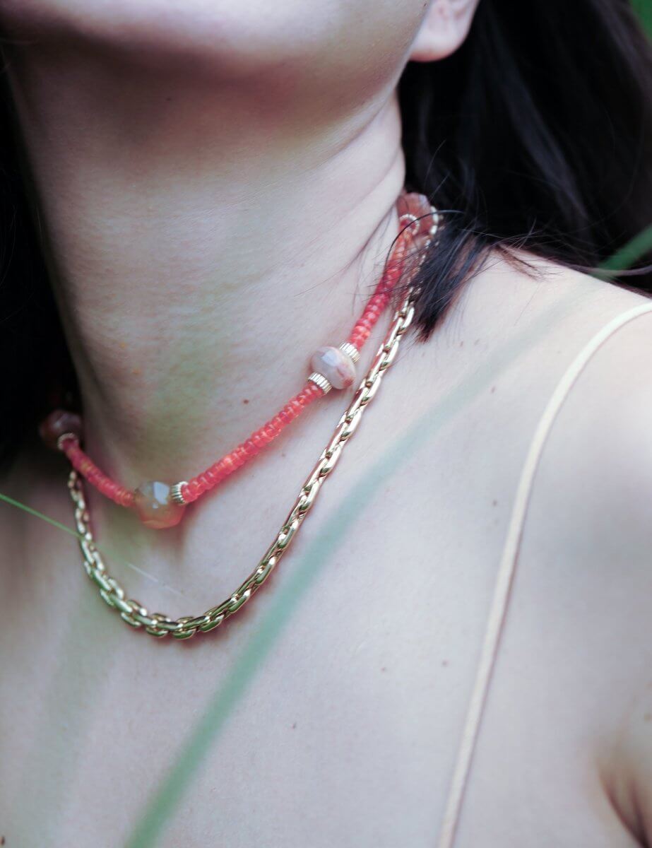 Romantic and expressive, this necklace unites fiery red opal with the soft floral tones of cherry blossom agate. It’s a wearable love letter to passion, compassion, and the beauty of inner healing. Finished with gold-plated 925 sterling silver accents for a refined, grounded touch.