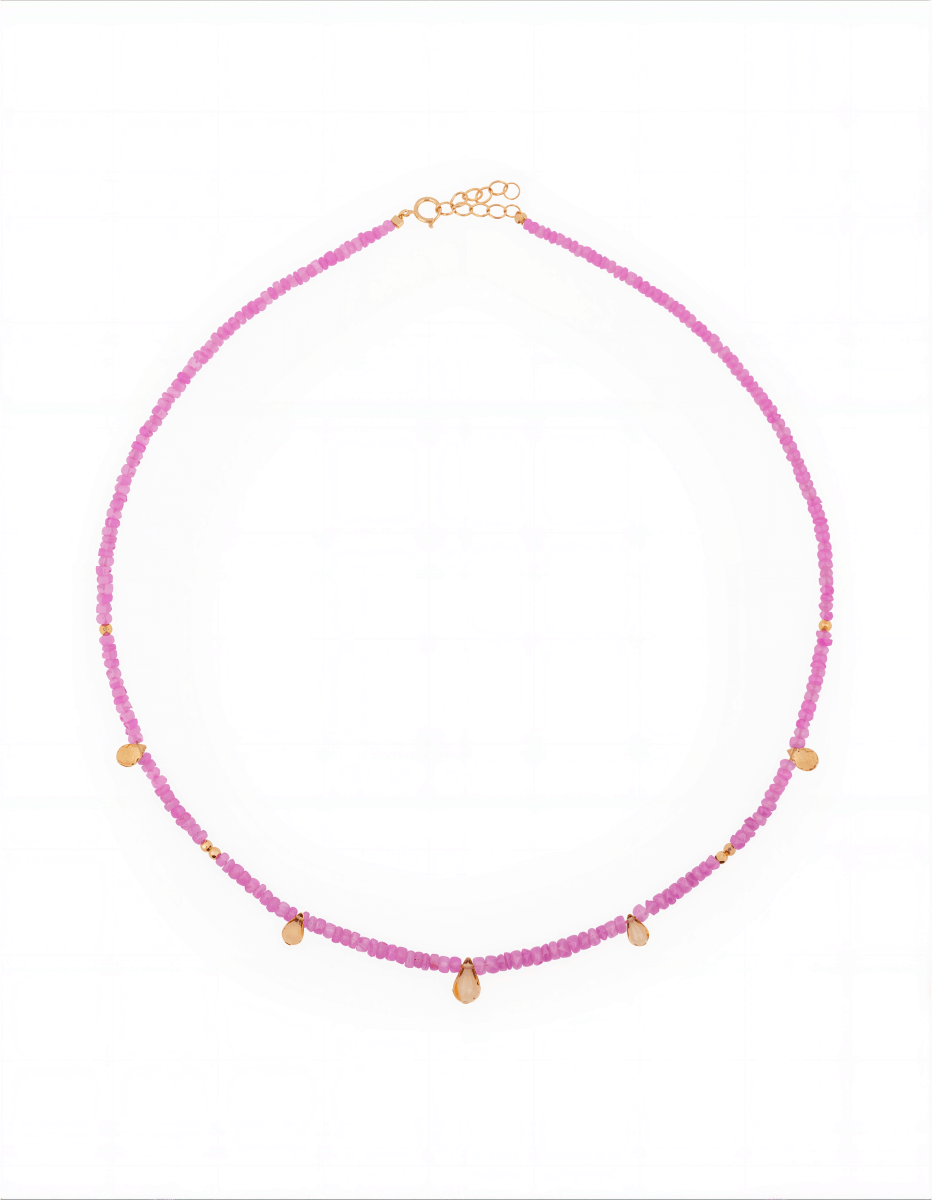 A refined pop of color in solid 18K gold. Pink sapphire and citrine meet in a clean drop pendant that feels bright, feminine, and quietly powerful—made for everyday elegance and meaningful gifting.